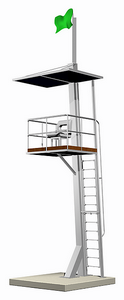 Escala encaixada en guies que permet pujar-la i fixar-la a 2 mts. del terra per a evitar que ningú pugi quan està fora de servei.